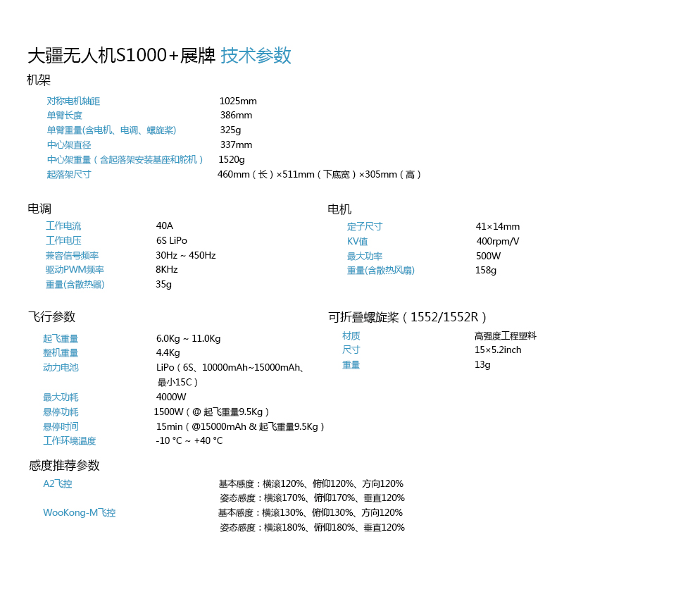 所有機臂均可向下折疊、配合 1552 折疊槳,可使整機運輸體積最小化,方便運輸攜帶。您只需抬起機臂、鎖緊機臂卡扣、給系統上電,就已經使S1000+進入了飛行就緒狀態,大大縮短每次飛行的準備時間。