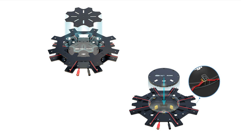 S1000+ 采用 V 型 8 旋翼設計,主要結構部件均采用質量強度比極高的碳纖維復合材料,在保證機身結構強度、剛度的同時大幅減輕重量。機身結構的系統性能兼容 DJI WKM/A2 多旋翼飛控。快速的響應頻率使你獲得流暢的操縱感。