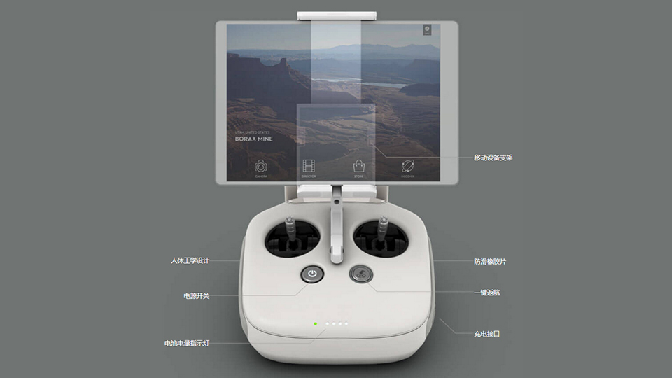 靈敏的控制搖桿及按鈕,高達 5 公里*的控制距離,Phantom 3 專業定制遙控器帶來更好的操控體驗和人機互動。符合人體工學的外形設計,手感舒適自如。
